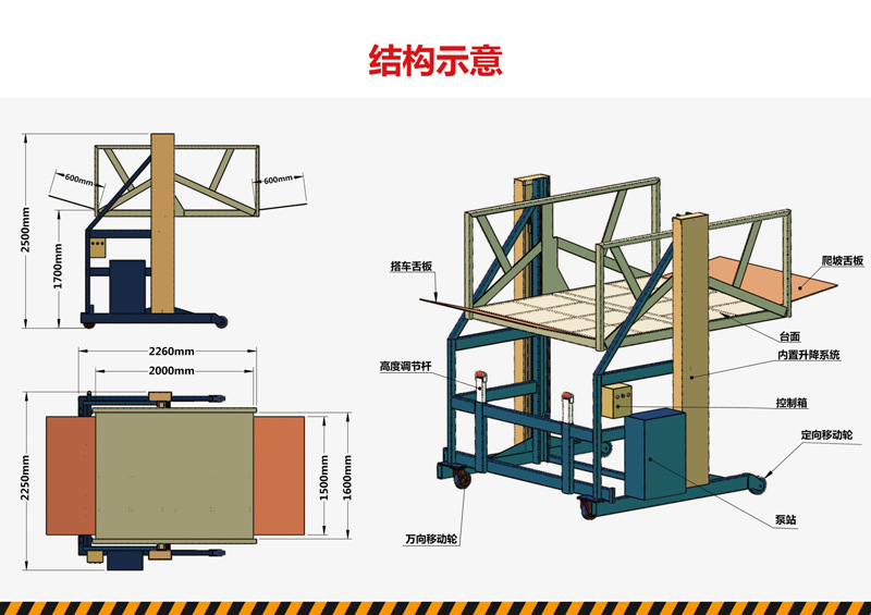 安全防护:液压安全锁防意外坠落、防滑台面、防护栏 / 裙板、限位装置等。